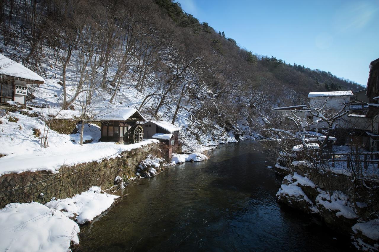 自炊部「湯治屋」露天風呂と豊沢川の絶景(冬)